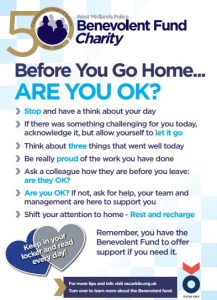 The ‘Before you go home’ checklist offers advice and an appeal to colleagues to check on each other and seek help if they need it, especially after a challenging shift or if their mental health is suffering.