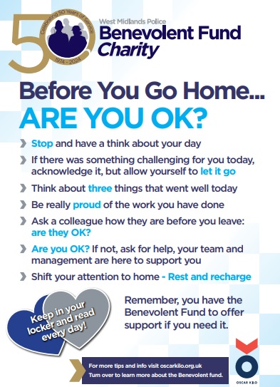 “This initiative has my full support. We have embraced the ‘Before you go home’ checklist here at Perry Barr by putting up posters from the Police Welfare service, however physically distributing a personalised version that features our very own police charity that staff can keep in their locker as a reminder, only reinforces how important it is for officers and staff to become members of the Benevolent Fund and seek help if they need it,” he explained.